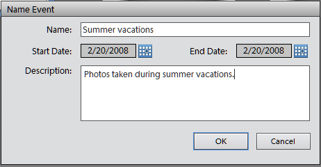 - メディアのグループ化条件、日付/時間:「日付」または「時間」ラジオボタンを選択して、写真が撮影された日付または時間に基づいて Elements Organizer でスマートイベントを表示させます。例えば、同じ日に同僚や友人の連続する誕生日があるなど、複数のイベントがあり、これらを別々のイベントとしてイベントビューで並べ替えたい場合があります。