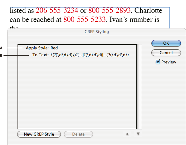正規表現スタイルの実際の例については、David Blatner による 5 Cool Things You Can Do with GREP Styles(英語)を参照してください。正規表現スタイルについては、Cari Jansen の Introducing GREP Styles(英語)から始まる 4 部構成のシリーズも参照してください。