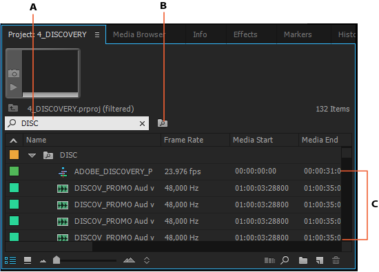 Premiere Pro には、複雑なプロジェクトであっても簡単にメディアファイルを検索し、検索にかかる時間を短縮して、より多くの時間を編集に使えるようにするために役立ついくつかの検索オプションがあります。