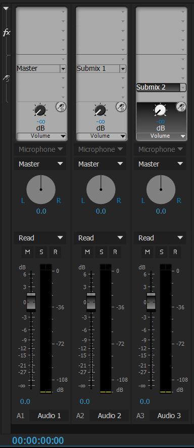 初期設定では、すべてのオーディオトラックはシーケンスのマスターオーディオトラックに出力されますが、サブミックストラックを作成することもできます。あらゆるトラックからサブミックストラックにオーディオを出力することができます。その後、サブミックストラックからマスタートラックにオーディオを出力することができます。オーディオトラックをサブミックストラックまたはマスタートラックの入力として使用することができます。サブミックストラックを、オーディオトラックの出力として使用したり、マスタートラックの入力として使用できます。同じシーケンス内の異なるトラックに、異なる数のチャンネルを含めることができます。例えば、モノラルのオーディオトラックからステレオのサブミックストラックに出力を送って、ステレオのサブミックストラックから 5.1 チャンネルのマスタートラックに出力を送ることができます。