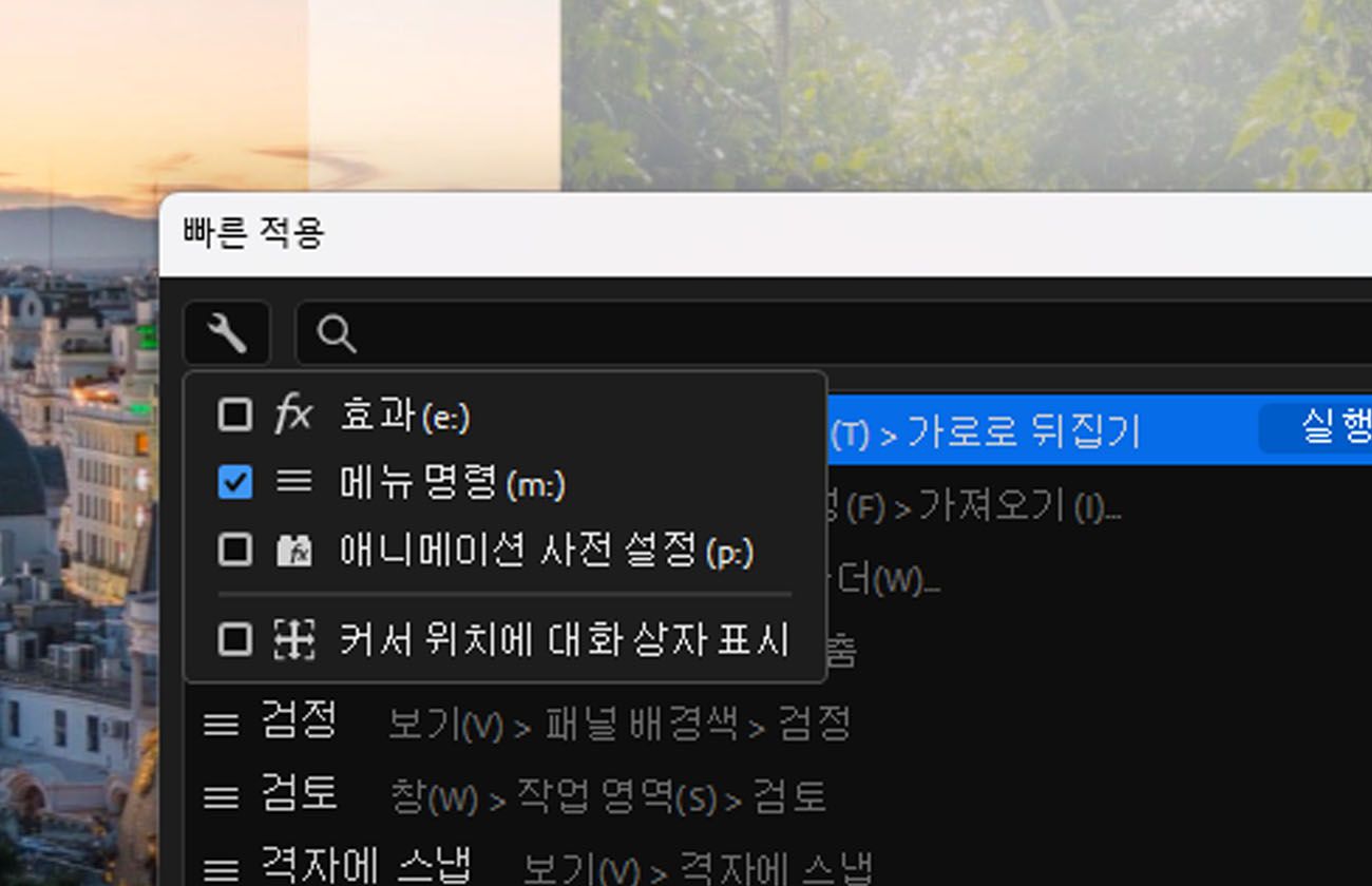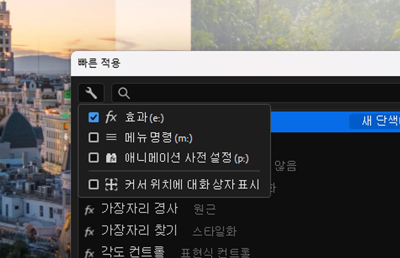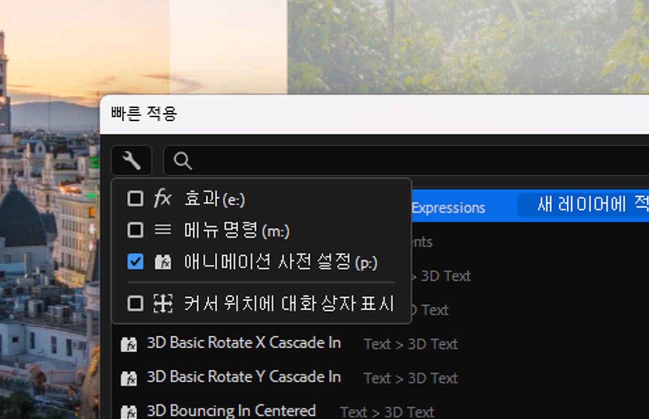 빠른 적용은 최신 버전의 After Effects에서 제공하는 간단한 검색 상자로, 효과, 애니메이션 사전 설정 또는 메뉴 명령을 빠르게 찾을 수 있도록 도와줍니다. 필요한 모든 것이 한 곳에 있습니다. 여러 패널과 메뉴를 클릭하는 대신, 몇 글자만 입력하면 일치하는 결과를 바로 확인할 수 있습니다. 원하는 항목을 찾으면 선택하여 즉시 적용하거나 실행할 수 있습니다. 레이어에 효과를 추가하거나, 애니메이션 사전 설정을 적용하거나, 메뉴 명령을 선택하는 경우 모두 가능합니다.