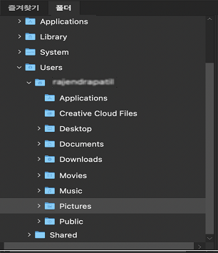 선택한 미디어 파일은 Adobe Bridge로 가져옵니다. 기본적으로 Bridge의 미디어 파일은 /Users/<사용자 이름>/Pictures로 가져옵니다. 폴더 패널에 있는 이 폴더를 찾을 수 있습니다.