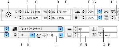 A. Reference point B. X Location C. Y Location D. Width E. Height F. Vertical scaling G. Horizontal scaling H. Character aki I. Line aki J. Grid format name K. Grid view L. Font size M. Frame grid characters per line N. Number of lines O. Number of columns P. Column gutter