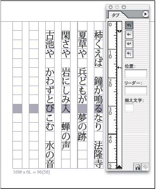 가로 프레임의 위쪽이 표시되면 [탭] 대화 상자는 현재 텍스트 프레임의 위쪽에 스냅하고 현재 단의 폭에 맞게 폭이 변경됩니다. 세로 프레임에 삽입점이 놓인 경우 [탭] 대화 상자는 텍스트 프레임의 오른쪽에 스냅하고 현재 단의 길이에 맞게 길이가 표시됩니다.