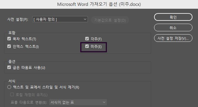 동시에 여러 Word 문서를 가져올 수 있습니다. 범위가 문서로 설정되어 있는 경우 모든 문서의 미주를 단일 텍스트 프레임으로 가져옵니다.