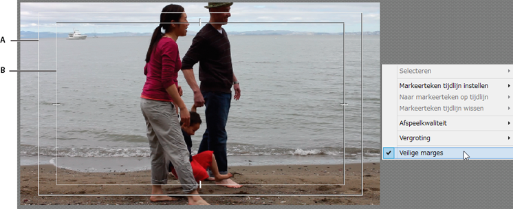 Klik met de rechtermuisknop of houd Ctrl ingedrukt en klik in het deelvenster Monitor en kies Weergave > Veilige titelmarge, Veilige actiemarge of Basislijnen tekst.