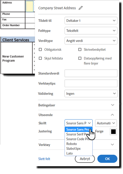 Redigeringsmiljøet i Adobe Acrobat Sign lar deg styre utseendet på skriften som vises i skjemafeltene. Elementer som kan styres, inkluderer skriftfamilie, størrelse, farge og justering.