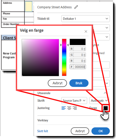 Farge lar deg definere skriftfargen for feltet. Du ser bare fargen som vises i PDF-kopien. Når du fyller ut feltet, forblir skriften svart.