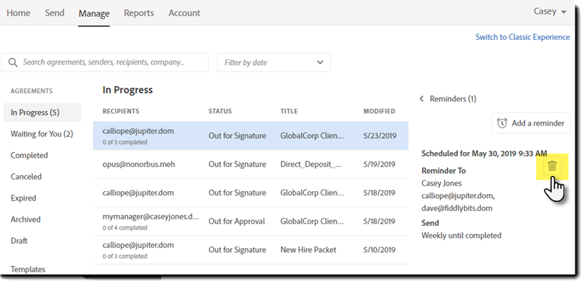 Når mottakeren fullfører handlingen i avtalen, avsluttes påminnelsesklokken for den mottakeren.