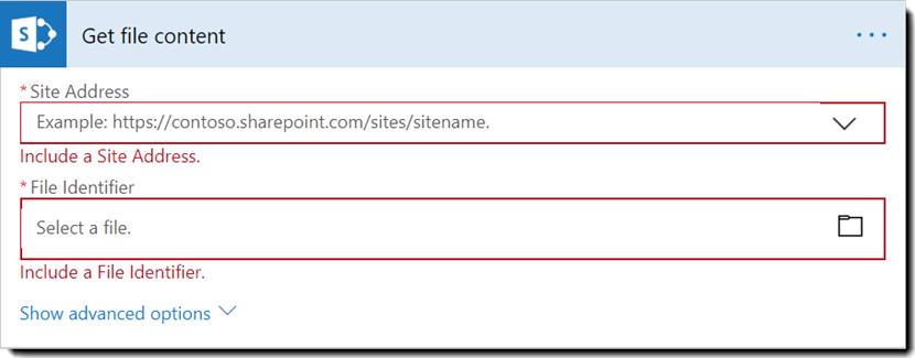Fylls i automatiskt med utdata från utlösaren ”För ett markerat objekt” i SharePoint. Namnet på dokumentet som ska överföras Grundläggande Filinnehåll