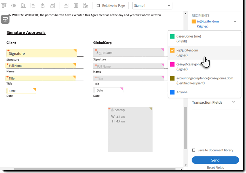 Placera alla fält för en mottagare och välj sedan nästa mottagare som måste ange innehåll eller signera och placera fälten. Gör det för varje mottagare av avtalet.