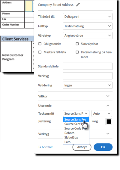 I redigeringsmiljön i Adobe Acrobat Sign kan du styra utseendet på det teckensnitt som visas i fälten på dina formulär. Element som kan styras inkluderar teckensnitt, storlek, färg och justering.