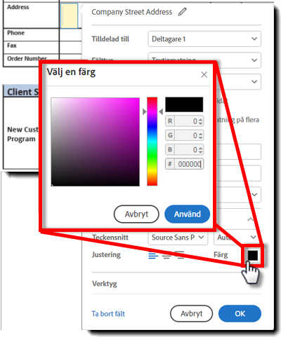 Med Färg kan du definiera teckenfärgen i fältet. Du kan endast se färgen i PDF-kopian. Medan du väljer färg förblir teckensnittet svart.