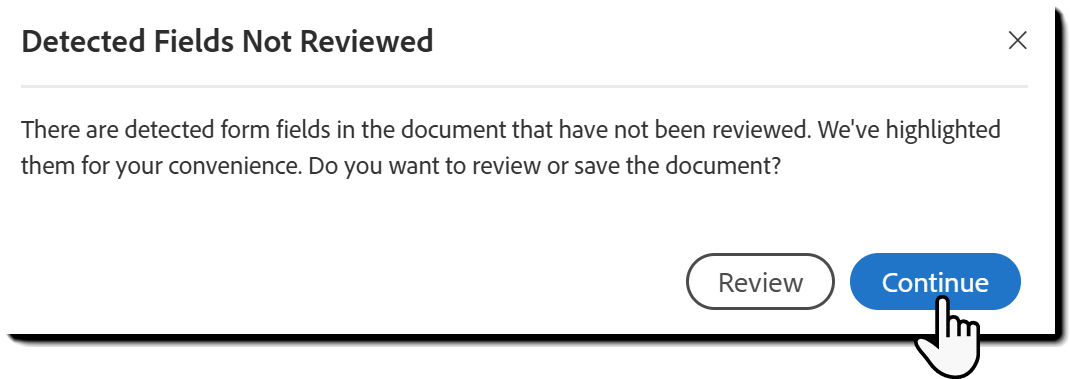 NoteIf you used automatic field detection and did not explicitly review all of your placed fields, this is when you'll be reminded: