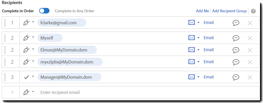 - Complete in Order is selected (as shown above), a sequential signing process is observed from one signing step to the next and recipients are numbered to indicate the exact participation order