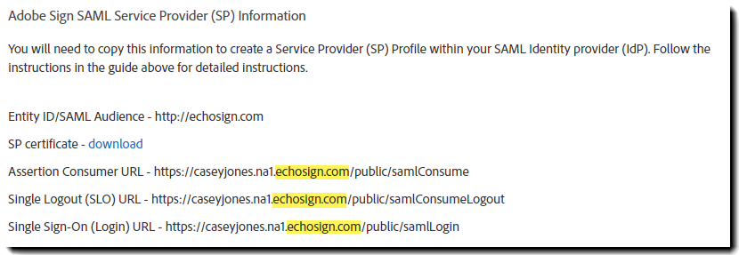 When migrating to a new domain, the Acrobat Sign Service Provider content on the Acrobat Sign SAML page will show the existing domain configuration.