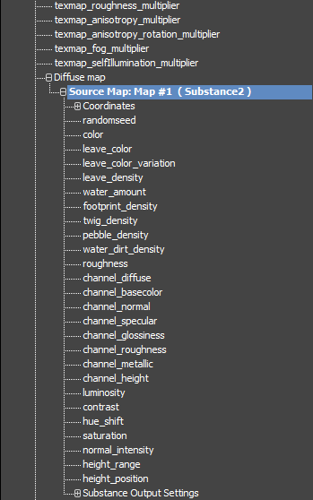 Scroll down to where you see the Diffuse Map and click the + to reveal Source Map parameters. Here you will see all of the parameters from the Substance file.