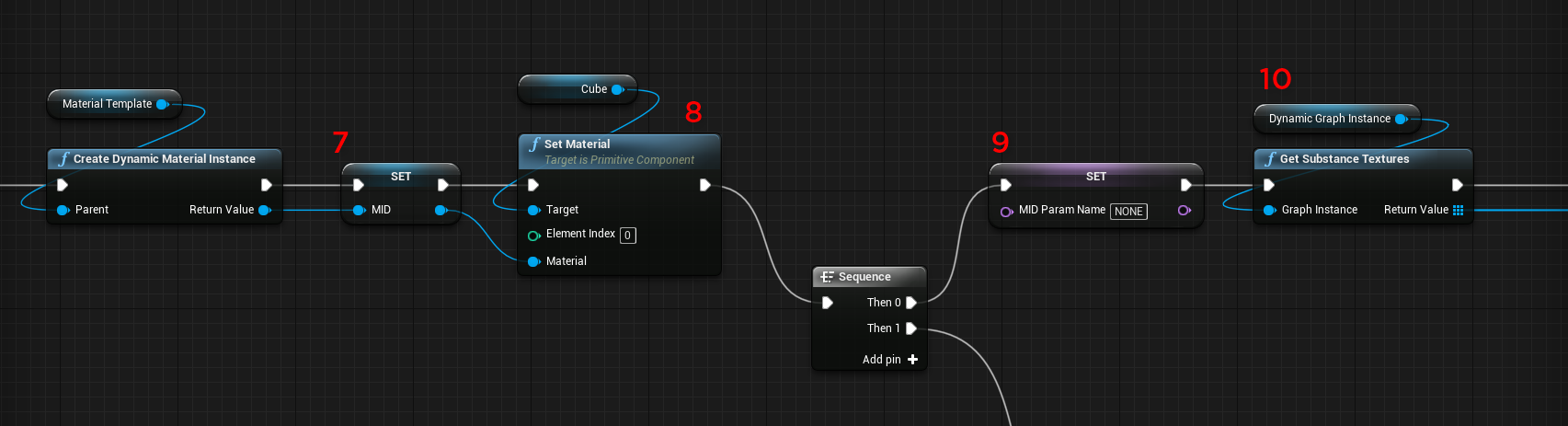 Set the variable for the dynamic substance material with the return value of the Create Graph Instance node.