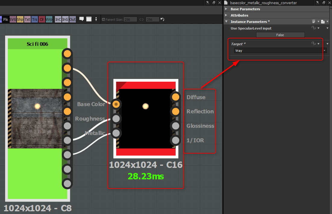 The Substance plugin will generate outputs and automatically create materials for specific workflows. However, with DCC applications and 3rd-party renderers, you may need to manually convert the metallic/rough outputs. The following integrations support automatic rendering workflows and will appropriately convert any map types if needed:
