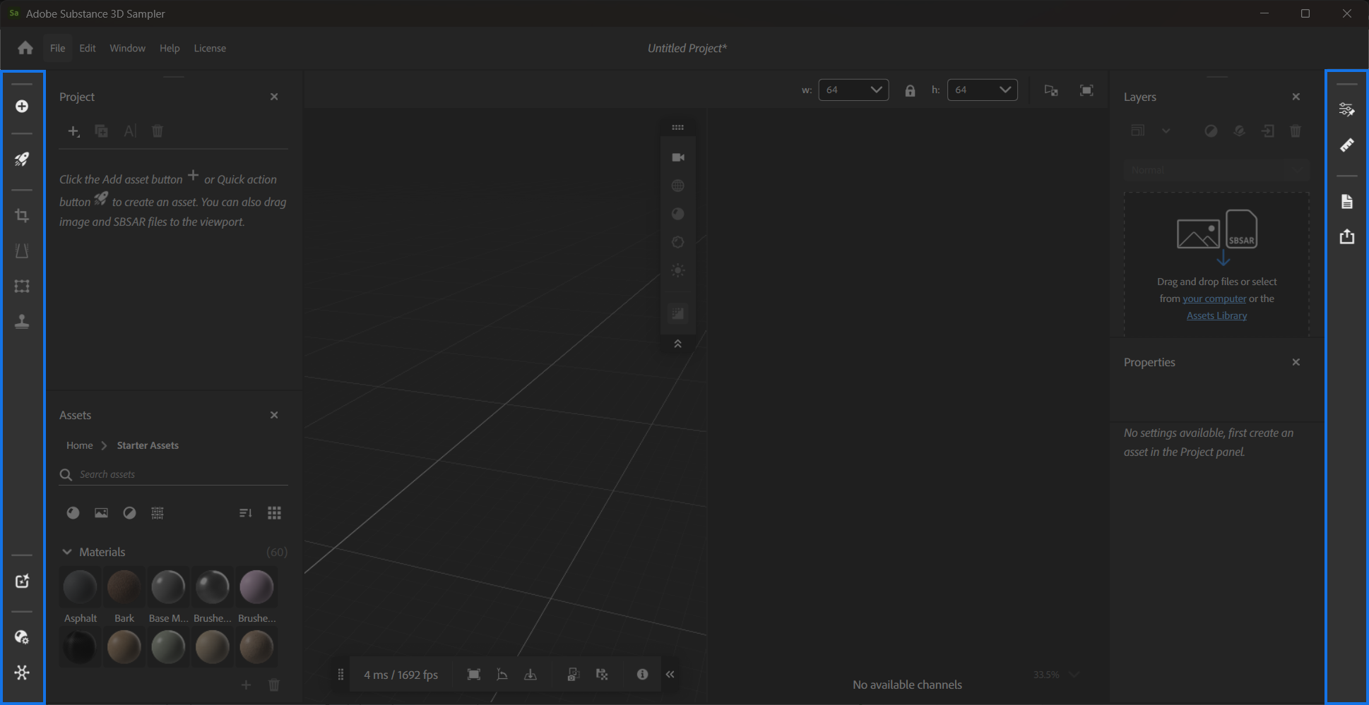 - The Get content button: import assets directly to the layer stack or to the Assets panel, or visit Substance Source to get more assets.